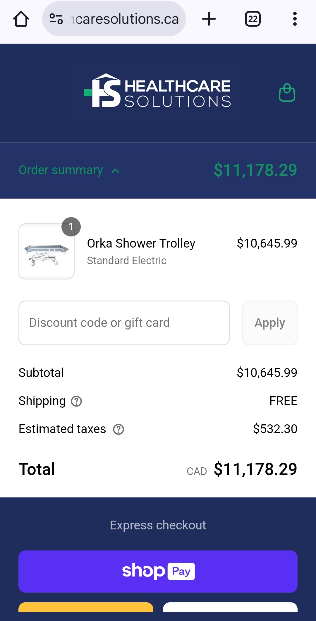 The Orka Shower Trolley is: $10,645.99 The taxes: $532.30 Shipping: Free Payment Processing fee on LG is: 2.99%+.30 = $334.53 LaunchGood Platform Fee is 0%